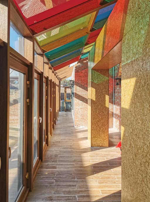 天友·零舍采用了可再生能源补给,屋面采用了传统民居双坡形式选择的非晶硅太阳能光伏瓦,不仅能为建筑提供自然转换的电能和热能,减少后期居住使用能耗,同时在太阳的照射下,形成波光粼粼的动态景象。阳光透过彩色薄膜光伏顶落在阳光房的墙面上,彩色的光晕将艺术氛围融入室内空间。